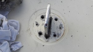 Nu de mast van de boot er af is ga ik de doorvoeren door het dek ook eens nalopen. Met name aan de stuurboord kant zijn er wat lekkages. De kit kleeft nog als kauwgum of is verweerd, geen overbodige luxe. Beetje bij beetje kan ik de oude kit verwijderen. Op een paar plekken is het ook ingewaterd en de houten laag onder het dek is wat verrot. Daar wil ik nog wat epoxy aanbrengen en alles weer opnieuw kitten.