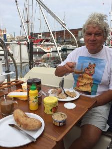 En dan kom je weer aan boord, en dan is het wel weer heel stil. Ik ga overdenken hoe mijn komende weken er uit zien. Het weer is niet echt geweldig, veel laaghangende bewolking en soms motregen. Mogelijk dat de herfst hier ook al z’n (mannelijk?) intrede doet. Ik voel er voorlopig niet veel voor om ergens te gaan ankeren. Dat zou natuurlijk wat geld uitsparen (een heer van stand praat niet over geld, een heer heeft geld…), maar de havens zijn hier redelijk goedkoop. Je kunt op elk moment van boord voor een terrasje of een wandeling.
