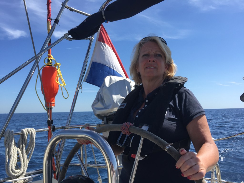 Monique de Roos (1964) 15 jaar geleden ben ik door Harm besmet geraakt met het zeilvirus. In augustus 2009 als opstapper vanaf Volendam heb ik samen met Harm de AJA via de staande mastroute dwars door Amsterdam (geweldig!) naar Dintelmond gevaren. Sindsdien heel veel meegezeild op Brabants water, daarna vanuit de thuishaven Colijnsplaat meegezeild op de Oosterschelde, Westerschelde, Noordzee, naar Engeland, langs de Belgische kust, Normandië, de kanaaleilanden en na het vertrek van Harm in 2017 heel vaak opgestapt o.a. in Noord Spanje, Portugal, Zuid Spanje, de oostkust van Spanje en meerdere keren naar en vanaf Ibiza en Mallorca meegezeild.